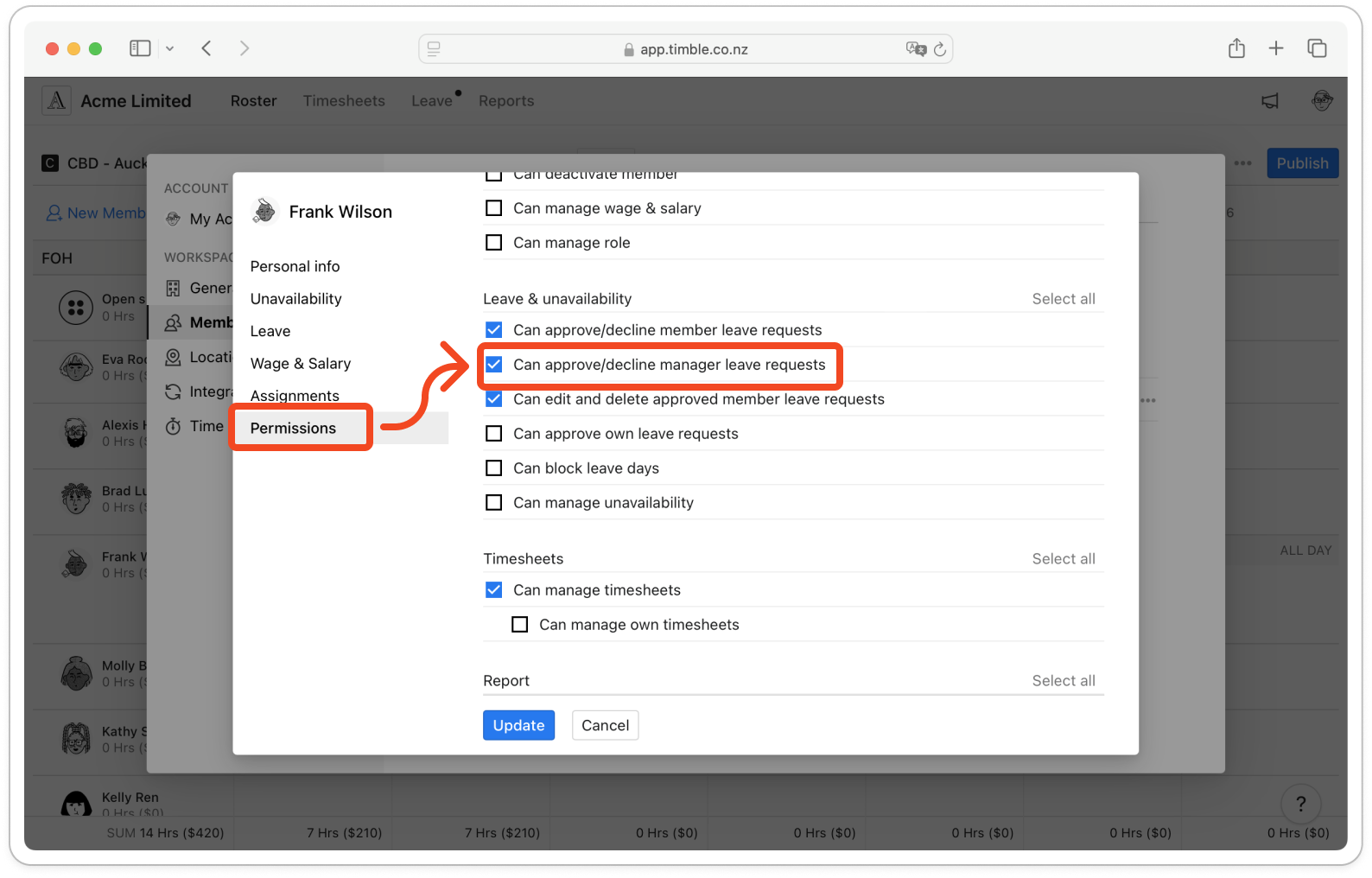 Important: This permission is separate from "Can approve/decline member leave requests". You can assign one, both, or neither depending on the manager's responsibilities.