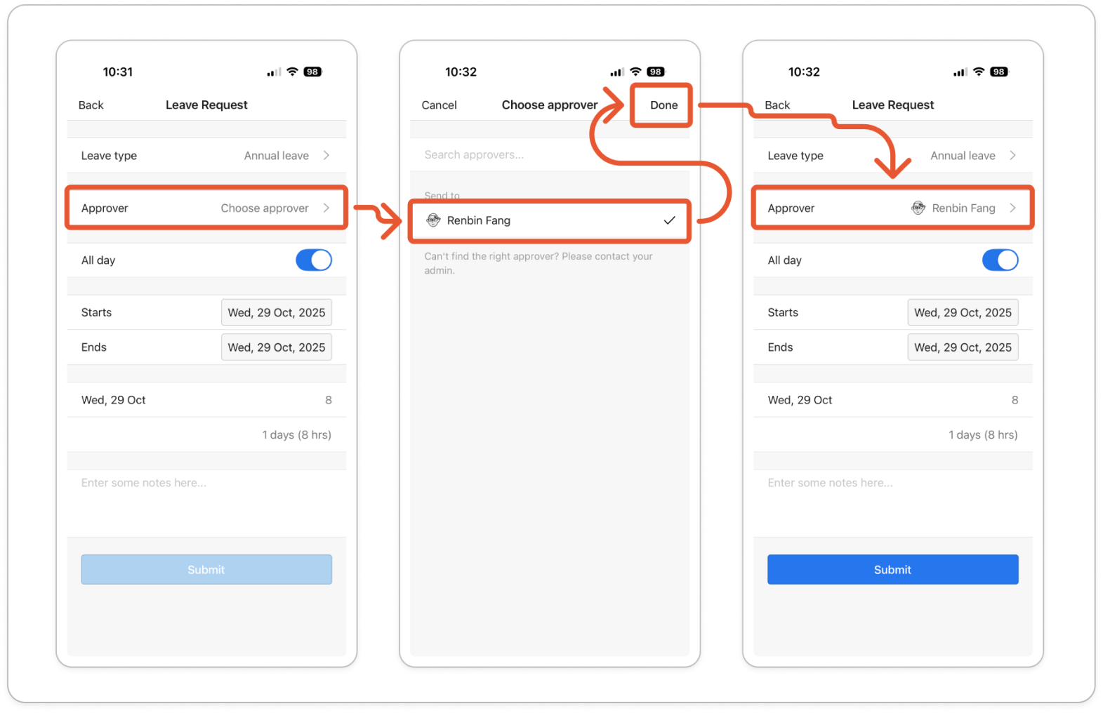 Managers can now choose who approves their leave requests, giving your business more flexibility in handling manager absences.