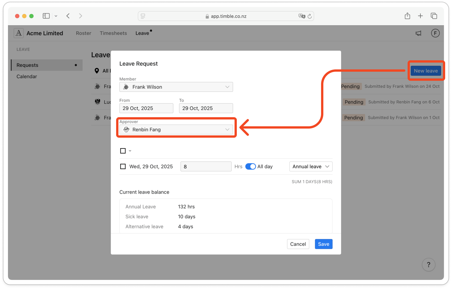 Note: Only managers with the "Can approve/decline manager leave requests" permission will appear in the approver selection list. Admins always appear as options.