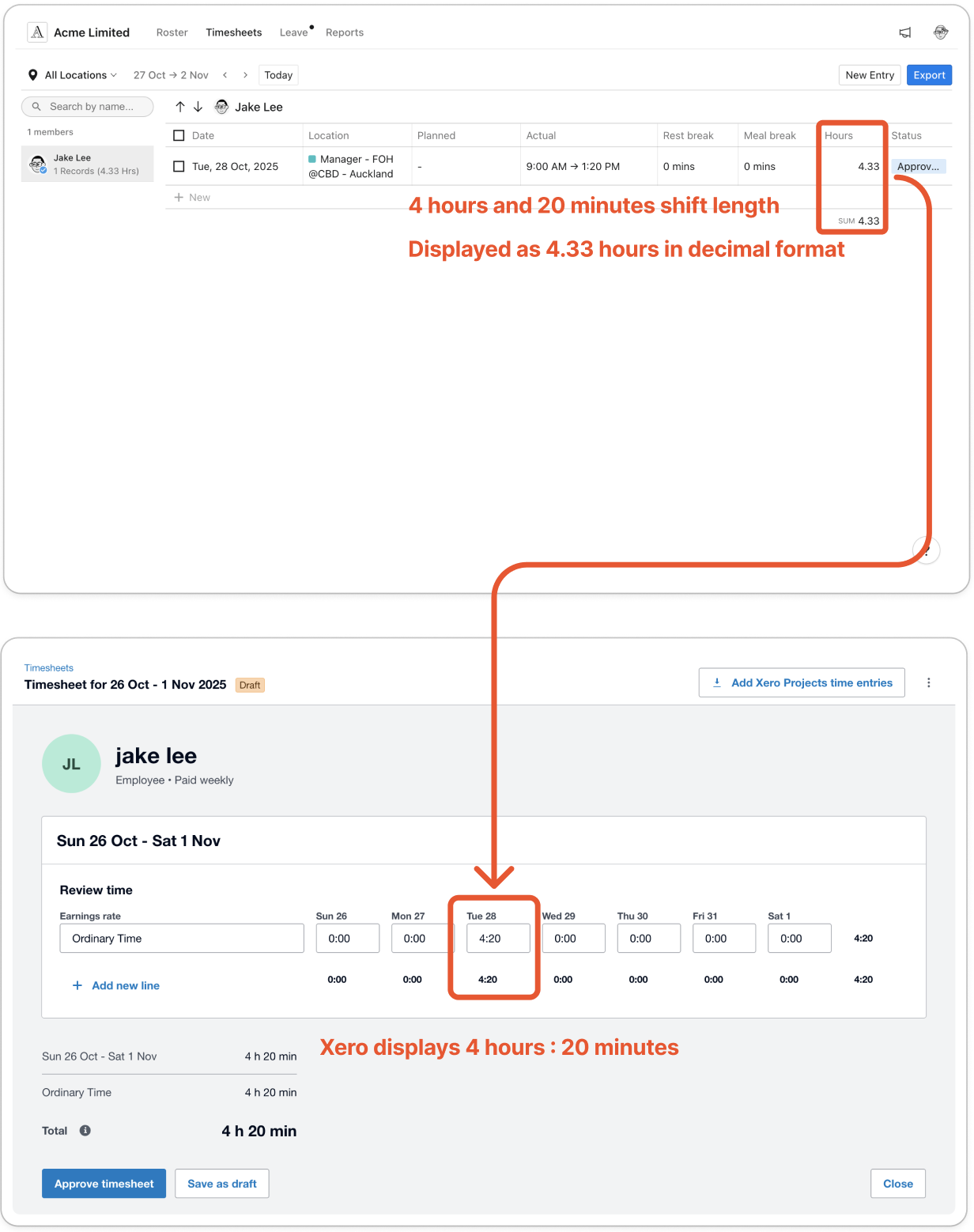 Timble shows total hours in decimal format, while Xero displays them in hours and minutes.